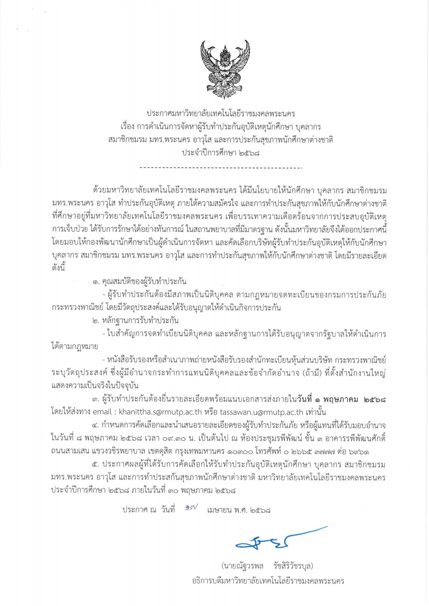 ข่าวประชาสัมพันธ์ ประกาศ เรื่อง การดำเนินการจัดหาผู้รับทำประกันอุบัติเหตุนักศึกษา บุคลากร สมาชิกชมรม มทร.พระนคร อาวุโส และการประกันสุขภาพนักศึกษาต่างชาติ ประจำปีการศึกษา 2568 Posted 21/04/202521/04/2025 teeranai